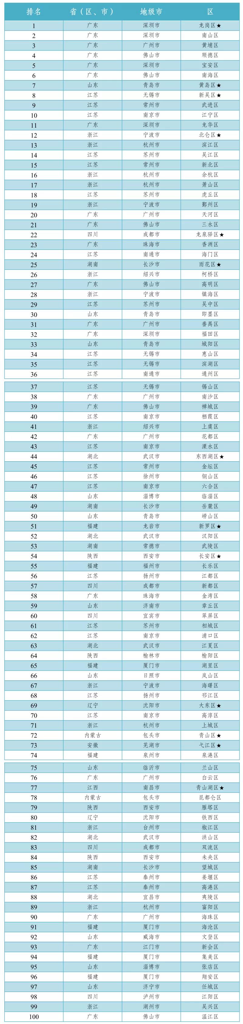 深圳、廣州、佛山、珠海、江門五個(gè)城市21個(gè)區(qū)在百?gòu)?qiáng)之列。大灣區(qū)包攬前六:龍崗區(qū)、南山區(qū)、黃埔區(qū) 、順德區(qū) 、寶安區(qū)、南海區(qū)。