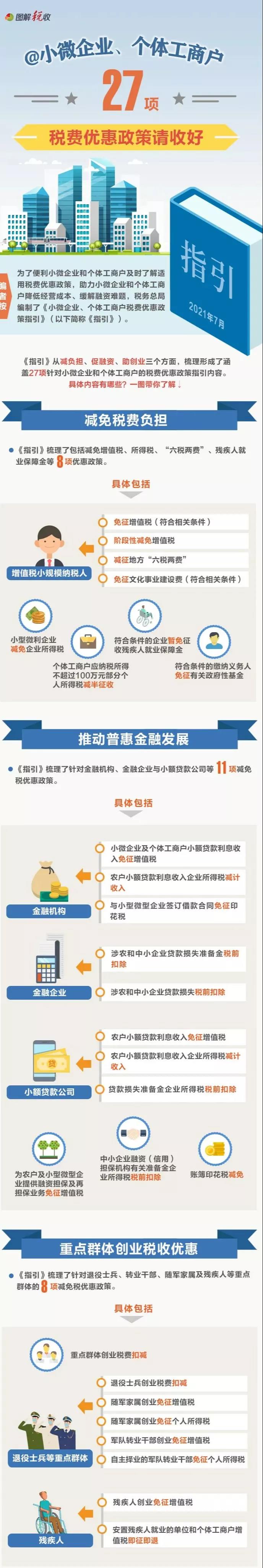 為了便利小微企業(yè)和個(gè)體工商戶及時(shí)了解適用稅費(fèi)優(yōu)惠政策,稅務(wù)總局編寫(xiě)了《小微企業(yè)、個(gè)體工商戶稅費(fèi)優(yōu)惠政策指引》,從減負(fù)擔(dān)、促融資、助創(chuàng)業(yè)三個(gè)方面,梳理匯集了27項(xiàng)針對(duì)小微企業(yè)和個(gè)體工商戶的稅費(fèi)優(yōu)惠政策。
