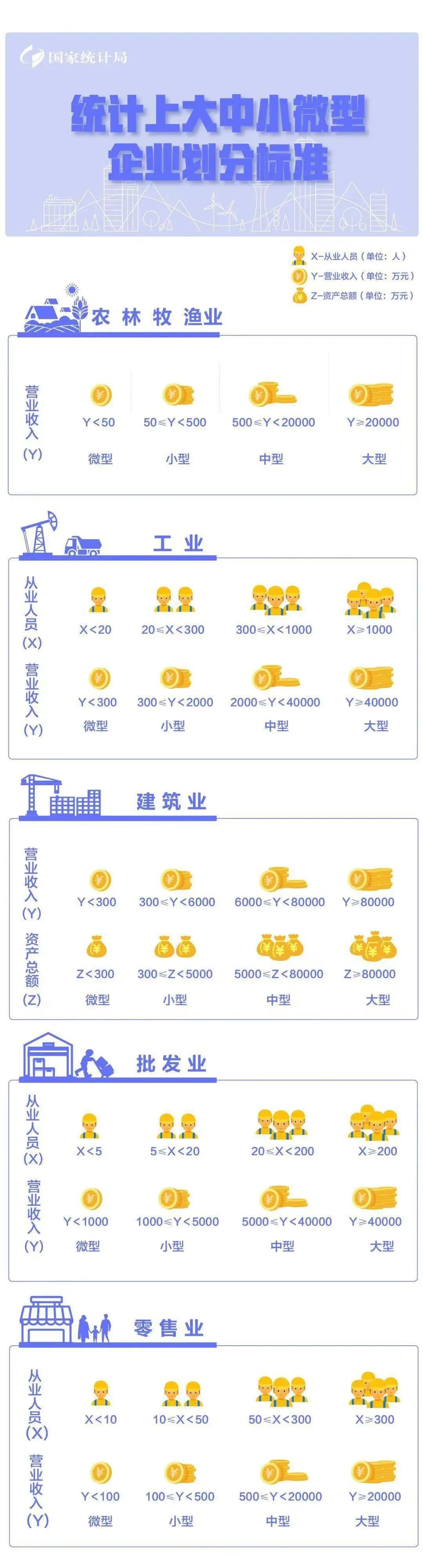 營業(yè)收入200000萬元以下或資產(chǎn)總額10000萬元以下的為中小微型企業(yè)。其中,營業(yè)收入1000萬元及以上,且資產(chǎn)總額5000萬元及以上的為中型企業(yè);營業(yè)收入100萬元及以上,且資產(chǎn)總額2000萬元及以上的為小型企業(yè);營業(yè)收入100萬元以下或資產(chǎn)總額2000萬元以下的為微型企業(yè)。