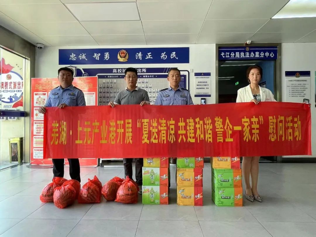 蕪湖上元產(chǎn)業(yè)園管理有限公司項目團隊為高校園區(qū)派出所送去水果飲品等夏日防暑禮包,在炎炎夏日給一線警務(wù)工作人員送去了絲絲涼意。