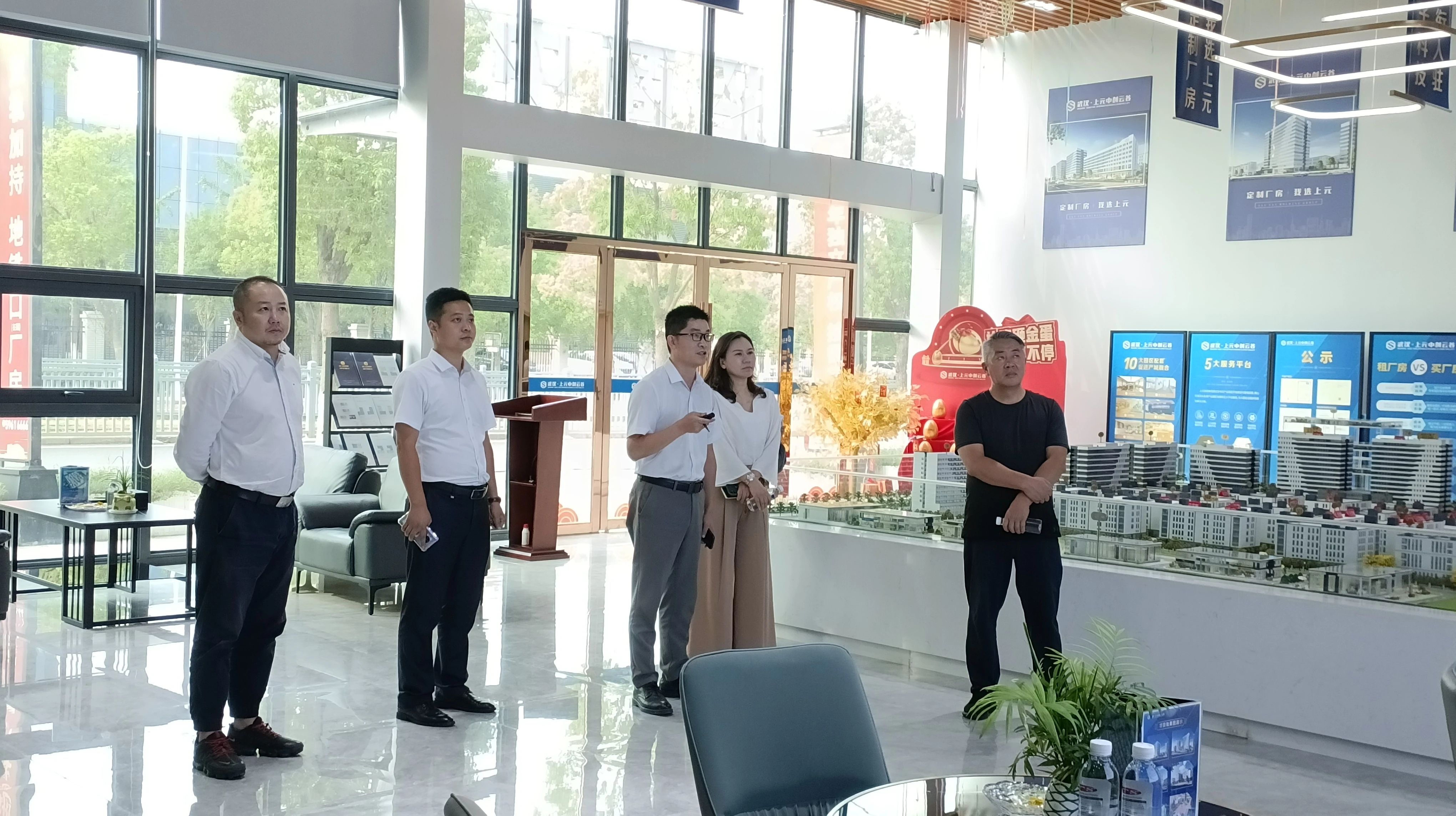 首先,項目講解員萬浩向考察團一行介紹了項目的整體布局情況、未來規(guī)劃、產(chǎn)品情況、招商情況、運營模式等。武漢項目營銷總監(jiān)張焱表示:武漢·上元中創(chuàng)云谷作為武漢市2023年市級重大項目,一直以來深受社會各界的關(guān)心和支持;園區(qū)精心打造的適合各種類型產(chǎn)業(yè)園區(qū)發(fā)展的“科技研發(fā)、人力資源、法律事務(wù)、財稅金融、智慧園區(qū)”五大服務(wù)平臺為企業(yè)發(fā)展保駕護航,讓企業(yè)經(jīng)營后顧無憂。
