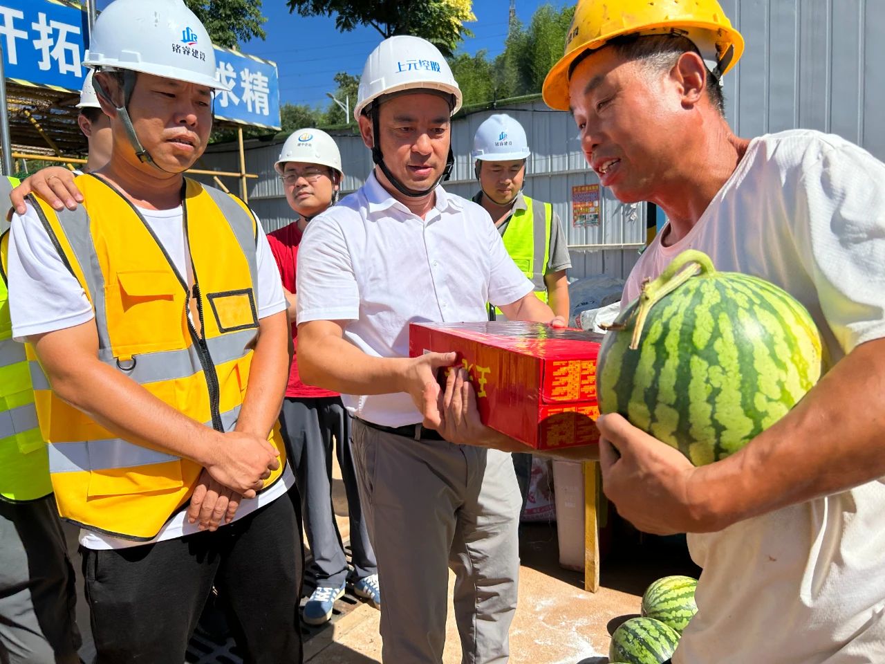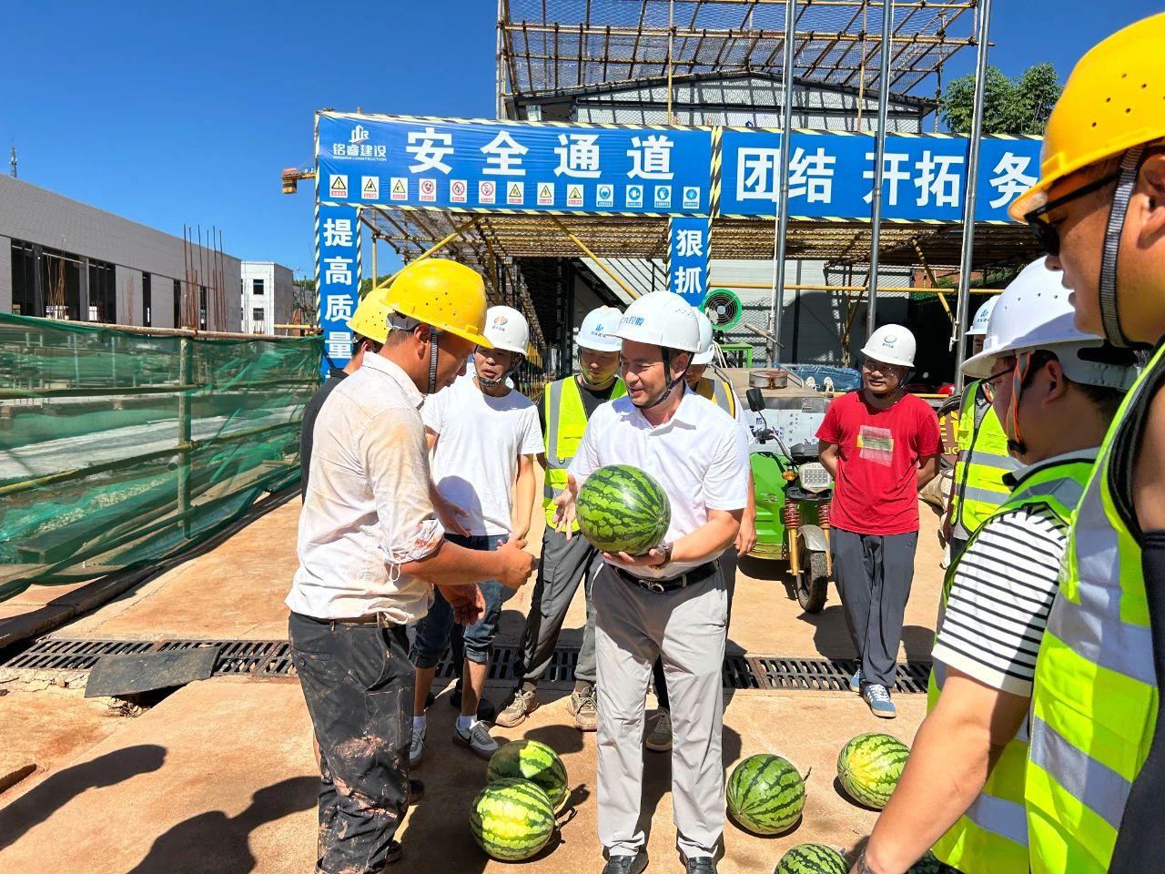 酷暑盛夏,“熱辣滾燙”,汛期剛過,又迎來高溫暑熱的伏天。湘潭項目一線的建設者們?nèi)詧允卦趰徫?。他們用熱愛、擔當?shù)钟邷兀萌缙俚暮顾_保項目穩(wěn)步推進,在平凡的崗位上貢獻著自己的力量。 7月30日,項目總經(jīng)理謝辭帶隊前往施工現(xiàn)場開展“送清涼”活動,為堅守崗位、奮戰(zhàn)一線的建設者們送去清涼與項目方的關懷,在炎炎夏日中為他們撐起“防暑遮陽傘”。項目精心準備了一系列防暑降溫物資,包括防暑藥品、飲品、西瓜等,總經(jīng)理謝辭親自將這些物資送到每一位工友的手中,并向他們致以親切的問候和衷心的感謝。
