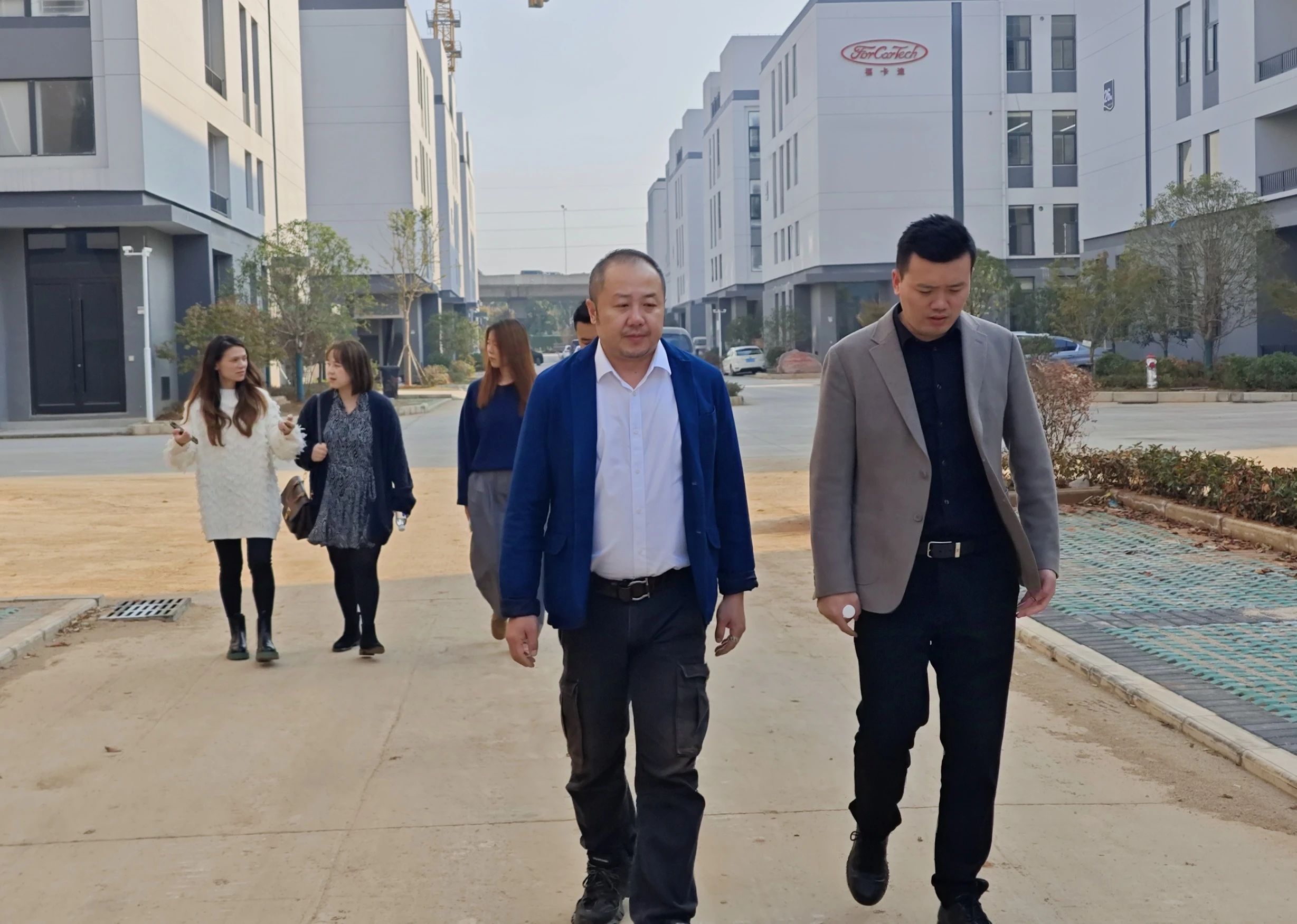 隨后,考察團一行深入園區(qū)內部進行實地探訪。項目分三期建設,規(guī)劃44棟高標廠房,產品可售可租,涵蓋3-5層多層廠房,11-15層高層廠房,以及一棟10層辦公樓與三棟保障性住房。目前一期、三期已順利投產運營,二期也在緊張有序的建設中。